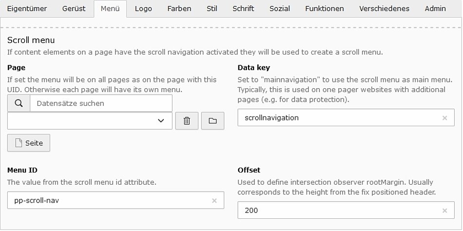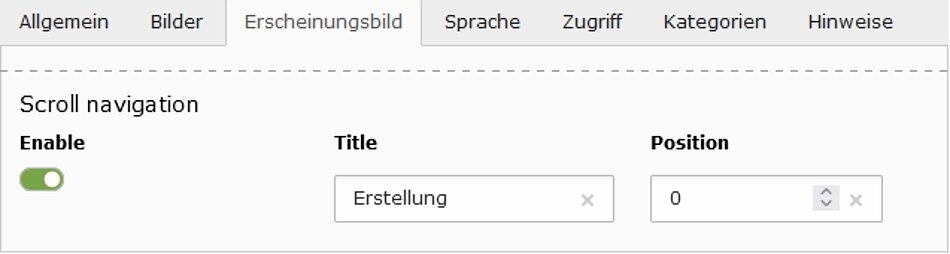 Den Inhaltselementen wurden Eigenschaften zur Erstellung eines Scrollmenüs hinzugefügt. Somit kann durch einfaches aktivieren der Scrollnavigation ein Eintrag dem Scrollmenü hinzugefügt werden. Der Menütext entspricht der Überschrift oder eines eigenen Textes. Bei Bedarf kann die Menüposition durch ein separates Feld bestimmt werden.